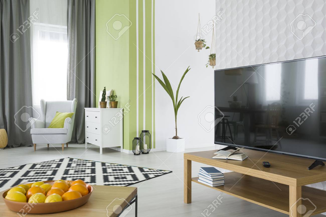 Living Room With White 3d Wallpaper Tv Dresser And Armchair