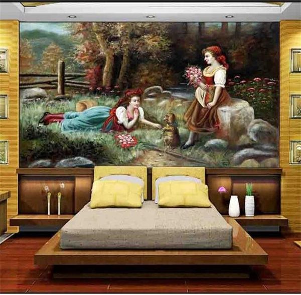 Custom Size 3d Photo Wallpaper Living Room Mural Oil Painting Woman Dog Flowers 3d Picture Sofa Tv Backdrop Wallpaper Non Woven Wall Sticker Love